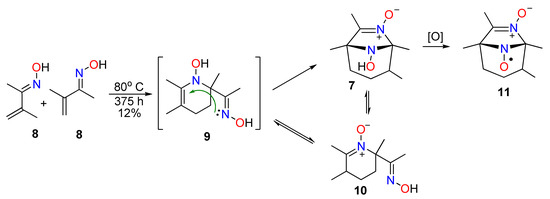 Formation of 8-hydroxy-1,4,5,7-tetramethyl-6,8-diazabicyclo[3.2.1]oct-6-ene 6-oxide 7 via cyclodimerization of unsaturated oxime 8.