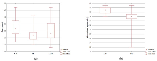 The Kruskal–Wallis ANOVA test results for: (a) Age. Years are presented as median values with interquartile ranges (IQR). Min-max are the minimum and maximum recorded values; (b) Gestational age. Weeks of gestation are presented as median values with interquartile ranges (IQR). Min-max are the minimum and maximum recorded values.