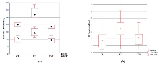 In our study, women from the CP group were significantly older than those in the PE group (p < 0.001) and the CNP group (p = 0.024). Logistic regression models showed that the presence of PE was associated with decreased odds of age. Other studies confirm that PE is more common among younger women and during a first pregnancy [23]. Moreover, maternal age (younger than 20 or older than 35 years) is a potential risk factor of PE [13,14]. The gestational age in the CP group was significantly longer than in the PE group (p < 0.001). The control groups included women at various stages of pregnancy, including term-pregnancies, while the delivery of women from the PE group usually occurred prematurely, hence the average gestational age in this group is lower. SBP and DBP values in the CP group were significantly lower than in the PE group (p < 0.001). Logistic regression analyses revealed a strong correlation of BLL with SBP and DBP in preeclamptic women (Table 2). There were no differences in SBP and DBP values between the CP group and the CNP group (pSBP = 0.64; pDBP = 0.52).