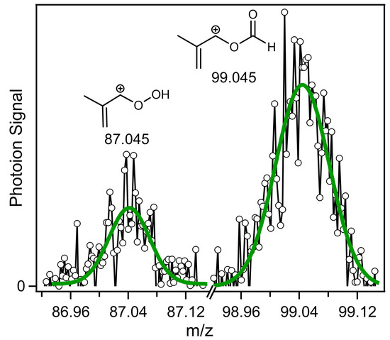 The proposed mechanism with formation of HPMAF is investigated via MPIMS experiments at 298 K (=25 °C) and 10 Torr (=13.3 hPa). Kinetically resolved signal is not observed on the parent mass channel of HPMAF (m/z 132) in the presence of formic acid. However, a strong signal appears in the mass spectrum at m/z 99. In addition, a weak signal present at m/z 87 is found to increase upon the addition of formic acid. Figure 1 shows a representative mass spectrum integrated over the full kinetic time window (0–60 ms) and VUV photon energy (9.0–11.0 eV, 50 meV steps). Gaussian fits of the mass spectra yield peak positions of 87.043 ± 0.003 and 99.045 ± 0.002, consistent with the exact chemical composition of C4H7O2 (87.045) and C5H7O2 (99.045), respectively. These product signals are in accord with HCO2-loss (m/z 87) and HO2-loss (m/z 99) fragment ions, respectively, observed from the photoionization of the functionalized hydroperoxide species formed from the reaction of MVK-oxide with formic acid (Scheme 1) [12,33]. The time profile of m/z 99 (Figure 2) obtained using 10.5 eV VUV photon energy exhibits a fast rise consistent with rapid reaction of Criegee intermediates with organic acids [12,16,33]. In addition, the amplitude of the product signal increases as a function of formic acid concentration indicating that it originates from reaction with MACR-oxide. The minor fragmentation pathway observed at m/z 87 is discussed in Section S1 of the Supplementary Materials (Figures S1–S3).