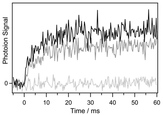 Temporal profile of m/z 99 observed from the reaction of MACR-oxide with formic acid (light grey line (formic acid) = 0 cm−3, dark grey line (formic acid) = 6.6 × 1012 cm−3, black line (formic acid) = 5.7 × 1013 cm−3) at a photoionization energy of 10.5 eV. The temporal profile reveals the rapid formation of a stable product that fragments upon ionization into a fragment ion at m/z 99. The small increase in the amplitude of the m/z 99 signal between the dark grey and black traces indicates the reaction is rapid and most of the MACR-oxide generated is reacted at (formic acid) = 6.6 × 1012 cm−3.