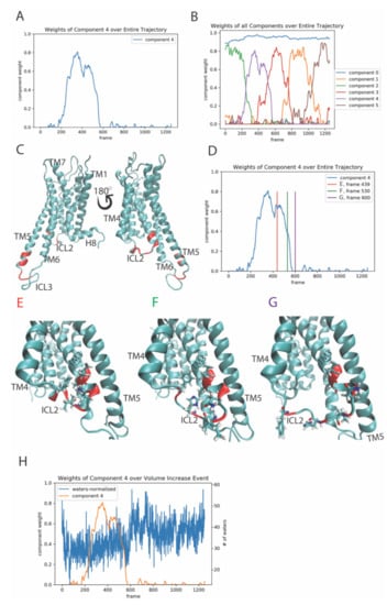 The top 10 features (residue pairs) with the highest weights of contribution to component 4 are highlighted in red on the 5-HT2AR structure (Figure 1C). Panels E–G of Figure 1 show snapshots of the receptor structure along the trajectory at specific positions on the weight plot of component 4, indicated in Figure 1D. Thus, the snapshots in this temporal sequence show the evolution of the conformational change in the ICL2 structure, i.e., before, during, and after the event detected by the algorithm. The helical secondary structure component of the ICL2 is seen to change during the event to unstructured. The residue pairs in the ICL2 that are in the top ten contributing features to component 4 are shown in stick model, visualizing the contacts that break during the waning of this event, and the gain in dominance of the structure defined by the second event. Shortly after becoming unstructured, the ICL2 moves away from the intracellular cavity, thereby increasing its volume and allowing for more water penetration into the cavity. The increase in volume, and thus increase in accessibility of this region is well known from the crystal structures to be involved in the interaction of the GPCR with the heterotrimeric G protein, showing that this second event is functionally “activation-related” (Figure 1H). The temporal relation of this occurrence is quantified in Figure 1H by the evolution of component 4 weights in the trajectory, starting at around frame 600 (i.e., ~1400 ns), and the completion of the event dominance with the increase in accessibility to the cavity.