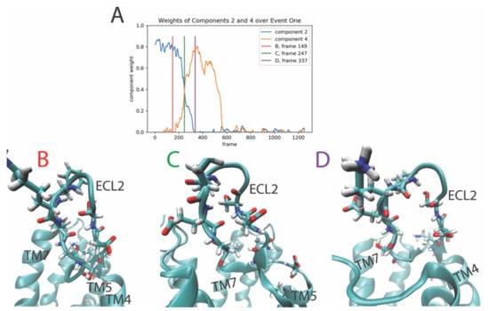 The changes in the structure of the GPCR/ligand complex that correspond to the conformational event represented by the evolution of the temporal weights from component 2 dominance to component 4 (Figure 2A), are illustrated in panels B–D of Figure 2. The snapshots show the structure of the receptor before the rare event (see Figure 2B, corresponding to the red line in Figure 2A), during it (Figure 2C, corresponding to the green line in Figure 2A), and after the event has occurred (Figure 2D and purple line in Figure 2A). The structural elements of the receptor that contribute the most to this transition between components 2 and 4, are rendered in a stick model on the structure of the second extracellular loop 2 (ECL2). Before the transition (Figure 2B), the ECL2 is in a closed, beta-sheet-like structure. The conformational transition involves an “unzipping”-like rearrangement of the secondary structure of the ECL2 with the bonds between the two ends of the ECL2 breaking and separating in a coordinated motion of the multiple residues involved in this rare event (Figure 2C,D).