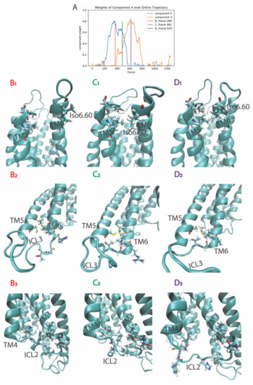 The conformational transition shown in the second row of each column (B2–D2) identifies the addition of a helical turn to the helical extension at the intracellular end of TM6, a region known for its involvement in the interaction of the activated receptor with the cognate G protein. Row 3 describes the contemporaneous conformational change in the secondary structure of the intracellular loop 2 (ICL2) (B3–D3). The temporal correlation of these conformational changes occurring in distal structural domains is sorted by the NMF algorithm into the same rare event, which suggests an allosteric pathway connection that can be verified and quantified by an analysis of allosteric pathways (e.g., [10,18]).