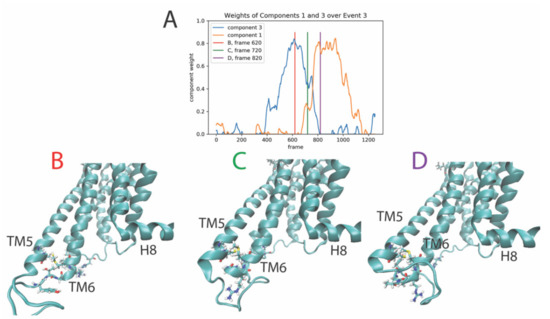 The third event is defined by the transition of dominance from component 3 (blue line in Figure 4A) to component 1 (orange line in Figure 4A), occurring roughly between trajectory frames 620-820 (time 1488 ns to 1968 ns). Figure 4 shows snapshots of the receptor structure before (Figure 4B), during (Figure 4C), and after (Figure 4D) the rare event. During this event, the intracellular end of TM6 moves outwards, away from the center of the intracellular end of the receptor, and the features of the receptor (NMF components) that contribute the most to components 3 and 1 are the residue pairs rendered in stick model with functional colors in the structure panels (4B–D).