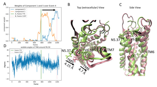 This event is defined by the transition of dominance from component 1 to component 5, occurring approximately between frames 775-1197 (time 1860 ns to 2827 ns) in the trajectory (Figure 5A). Panels B and C of Figure 5 show the conformational changes leading to the rearrangement of the binding pocket. The receptor is shown in the top and side views, respectively. During the event, the extracellular end of TM6 undergoes a 4.7 Å shift (as measured from the alpha carbon of Val6.59), caused by a reorientation of the TM6 segment following the proline kink around Pro6.50 towards the extracellular end of the TM. The reorientation (Figure 5D) is due to a decrease of ~20° in the wobble angle of the proline kink (see [19]). This change is accompanied by a 4.15 Å shift in the extracellular end of TM5 (as measured from the Calpha of Asn5.37). Together, these shifts result in the formation of a stable contact between Asn5.37 and Val6.59 during the event (see pink structure in Panels B and C of Figure 5) that did not exist before the event (see green structure in Panels B and C of Figure 5). The Asn5.37-Val6.59 contact pair was one of the top ten features identified by component 5 of the RED protocol.