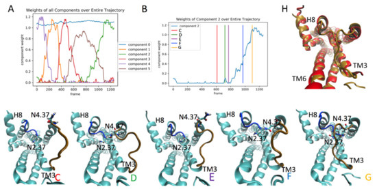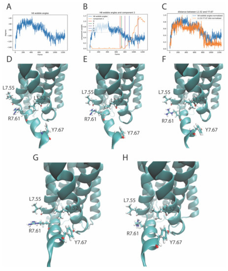 Component 2 of the rare event in the trajectory of the KET-bound 5-HT2AR simulation described above (Section 2.4.1) is an example of the structural complexity of the concurrent conformational transitions detected by the RED protocol. Like component 4 of the 5-HT-bound 5-HT2AR simulation, it involves local and more distal structural elements, which undergo transitions to states that have specific functional roles. Thus, an intriguing observation from the analysis of the elements (residue pairs) of component 2 (Figure 7, panels B and C) is that, in addition to the residues in ICL2 and TM2, interactions involving Helix 8 (H8) residues are also included and highlighted among the top ten residue pairs that contribute to this component. Inspection of the trajectory revealed that, during the rising edge of the smaller spike (at frame ~700), the formation of the contact between Leu7.55 and Arg7.61 in TM7 (Figure 8E) coincides with the decrease in the wobble angle of H8 (Figure 8B). The wobble angle quantified in Figure 8B is defined analogously to the proline kink wobble angle [19], but using Arg7.57 as the center of the reorientation. The helical segments that reorient are the Ser7.46-Phe7.56, and the Lys7.58-Iso7.68. The conformational change is visualized by comparing the structures in panels D and E of Figure 8, which show the salient components in TM7 and HX8 identified by the RED as contributing to the event. The structures correspond to the conformations at times in the trajectories identified by the corresponding vertical lines in Figure 8B (marked D and E). Subsequently, during the larger spike in component 2, which evolves in frames 800-1200, there is a further decrease in the wobble angle of HX8 (Figure 8A), and a change in the contact between Leu1.52-Tyr7.67 at the times indicated by vertical lines F, G, and H (see Figure 8, panels F–H). The relation between global conformational changes (Hx8 wobble angles) and local conformational changes (residue–residue interactions) in the elements of component 2 is demonstrated in Figure 8C by the high correlation between the inter-residue distance L1.52-Y7.67 with the H8 wobble angle. Note that the changes in the H8 (Figure 8A) occur at the same time as the changes in ICL1 and ICL2, described in Figure 6 and Figure 7, and are sorted into the same component and event by the RED protocol.
