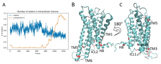 Panel (A) Component 2 (orange line) plotted alongside the number of water molecules in the intracellular cavity of the receptor over the frames of the trajectory (see methods for details). The scalebar is normalized to 1 for comparison with component 2. Panels (B,C) show snapshots of the receptor, with the residues constituting the top ten contributing residue pairs of component 2, highlighted in red. These residues are Leu1.52, Asn2.37 (ICL1), Tyr2.41, Glu3.55, Asn4.37 (ICL2), Asp5.35, Val5.39, Leu5.71, Cys5.72, Asp5.75, Leu5.76, Arg5.79(ICL3), Ser5.84 (ICL3), Arg6.21 (ICL3), Leu7.55, Arg7.61 (Helix 8), Tyr7.67 (Helix 8).