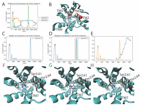Only three components needed to be considered for this smaller data vector, and additional constraints were added to increase the sparseness and temporal smoothness of the components. The weights of the three NMF components plotted against time in Figure 9A show component 2 to contain the largest absolute weights. The top 10 features (residues) with the highest weights of contribution to component 2 are highlighted in red on the 5-HT2AR structure in Figure 9B. For clarity, Figure 9C shows component 2 in isolation from the other two components. The event occurring during this largest spike was analyzed by observing frames before, during, and after the event at times indicated by the colored vertical lines in Figure 9D. The structures from trajectory snapshots at the times indicated by these vertical lines are shown in Figure 9F–H. The sequence of snapshots shows that component 2 represents a reorientation of the headgroup of the ligand, from pointing towards TM7 to pointing towards TM2. This is evidenced by the formation of a contact between the ligand and Ser2.61 and Thr2.64, two residues whose weight of contribution to component 2 is in the top ten. The temporal proximity of this rare event to the conformational changes in the 5-HT2AR discussed in previous sections is evidenced in Figure 9E, in which the largest spike, which starts around frame 820, occurs at the same trajectory time as the base of the main hump of component 2 identified in the RED analysis of the protein (not the ligand) in the 5-HT2AR/KET trajectory (see Figure 6B). As presented in Section 2.4.1 and Section 2.4.2 this signals the start the conformational events in the intracellular side of the receptor at the same time. This temporal sequence is thus suggestive of a causative relation between these sets of events in protein regions far from one another in the molecular scale. Whether the conformational transition observed in the protein is triggered allosterically by the reorientation of the ligand, and how, is the topic of a forthcoming analysis with the quantitative tools developed specifically for this purpose [10,18,23,24].