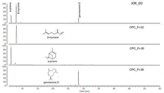 The GC-MS analysis of CPC fractions verified the elution order of the target compounds witch was calculated based on the KD values. β-Myrcene was eluted first, and collected on fractions 17–26, α-pinene on fractions 26–36, while germacrene D was eluted during the extrusion step and collected in fractions 34–41. Regarding the purity of the isolated compounds, β-myrcene was recovered with high purity (>95%), germacrene D wiith a purity of approximately 85% (on fractions 37–40) while α-pinene was collected in mixture with its isomer β-pinene (Figure 1) in the fractions 26–30, almost in a pure form in the next three fractions (31–33) and in a mixture with germacrene D in the last fractions of its elution (34–36).