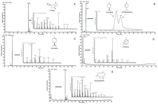 GC-MS analysis of CPC fractions obtained from the treatment of P. pinea (PPI) essential oil. (A): fr. 12–15; (B): fr. 23–27; (C): fr. 28–32; (D): fr. 34–35; (E): fr. 39–43.
