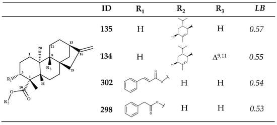 Additionally, two additional kauranes isolated from Wedelia trilobata, structures 298 and 302, also presented LB values greater than 0.5. Cinnamoyl (302) and 2-phenylacetic (298) esters are established with the carboxyl group of the kaurenoic acid (Figure 1) []. In these two structures, the functional groups present in R3 were also found to play key roles, as structure 301, which also includes a cinnamoyl ester, was classified as inactive (LB = 0.48). The presence of a hydroxyl moiety in R3 represents the unique structural difference between structures 301 and the active structure 302.