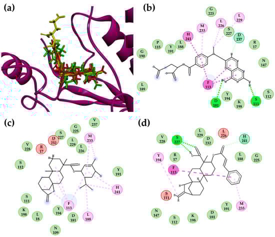 Methotrexate achieved a docking score of −560.4 kJ/mol in the active site of LmPTR1, and the formation of two H-bond interactions with S111 and N118 were observed (Figure 2b). Structure 302 also formed two H-bonds between S227 and the carboxylic group of C-19. Additionally, the aromatic ring of F113 interacted with both 135 and 302, in addition to methotrexate, through π–π and π–alkyl interactions. Two steric interactions that unfavorably influenced the molecular binding energy were identified for the structures 135 (R17 and D232) and 302 (S111 and L226), as shown in Figure 2c,d, respectively.