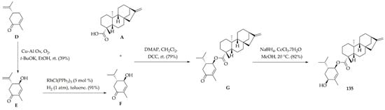 Diterpenic acid A esterified with F under mild conditions via Steglich esterification [] to produce 2-oxo-menth-6-en-5β-yl ent-kaurenoate (G). This monoterpene/diterpene ester adduct was finally converted into 2β-hydroxy-menth-6-en-5β-yl ent-kaurenoate (135) through the selective 1,2 reduction of α,β-unsaturated ketones using Luche conditions [], whose Re face of the enone in G favored the desired β-epimer (68% epimeric excess).