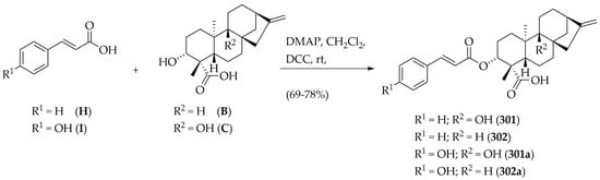 Steglich esterification was also exploited to obtain the other two selected diterpenes (Figure 4). Isolated compounds B and C were separately esterified with cinnamic acid (H), yielding the phenylpropanoid/diterpene ester adducts 301 and 302, respectively, with good yields (78%–79%). Additionally, the scope of this reaction was expanded to produce compounds 301a and 302a, using the same diterpene precursors (B and C) condensed with p-coumaric acid (I) to observe the influence of the p-hydroxyl group at the phenylpropanoid moiety in the subsequent enzymatic study.