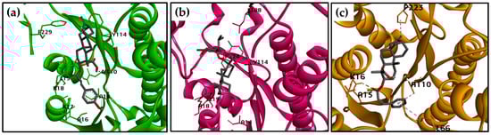 Docking formations between a structure 302 in the active site of (a) LpPTR1, (b) LbPTR1, and (c) LaPTR1. Labels: H-bonds (green), π-alkyl interactions (purple).