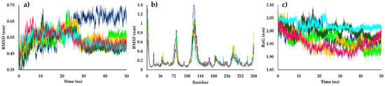 (a) Root-mean-square deviation (RMSD), (b) root-mean-square-fluctuation (RMSF), and (c) radius of gyration (RoG) values within the LbPTR1 binding site, obtained after molecular dynamics simulations using three of the best-ranked structures in molecular docking calculations. apoLbPTR1 (blue); DHB: LbPTR1 complex (light green); PMA: LbPTR1 complex (sky blue); structure 135: LbPTR1 complex (pink); structure 302: LbPTR1 complex (yellow); structure 302a: LbPTR1 complex (dark green).