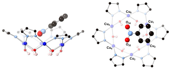 | Cu6–O5 1.916(3) | Cu13–N24 1.953(3) | Cu21–O21 1.911(3) | Cu28–O30 1.954(3) |