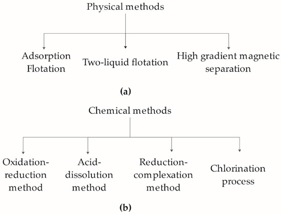 The conventional kaolin refining technology can be divided into three approaches: physical (Figure 1a), chemical (Figure 1b), and microbial methods; but each approach presents many limitations. The physical process is ineffective in purifying heavily contaminated kaolin clay, relying on heavy equipment, trained personnel, and expansive energy consumption [3,4,5,6]. The more effective chemical method removes iron contaminants but employs various chemical reagents to facilitate the iron reduction process. This process is found to be hazardous to both personnel and the environment [7,8]. Lately, microbial-based treatment has become an emerging technology used for removing iron contaminants. This approach does not affect kaolin’s physical and chemical properties, and requiring low energy consumption with minimal impact on the environment. However, the processing time and the cultivation conditions (temperature, pH, medium conditions, and so forth) prevent the technology from moving forward.