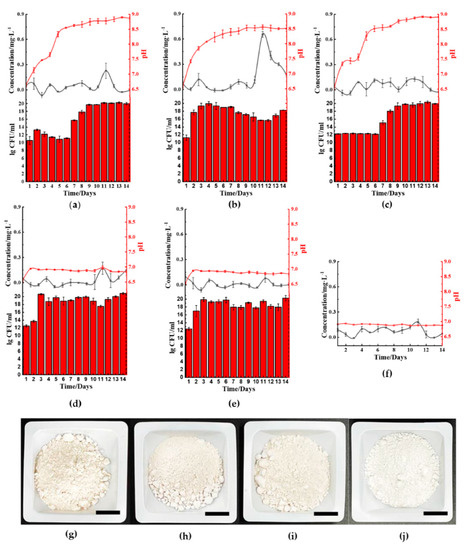 Microbial-mediated ferric(III)oxide reduction in kaolin clay cultured in nitrogen-rich media. (a) B. cereus. (b) S. aureus. (c) B. thailandeensis. (d) E. coli. (e) P. aeruginosa. (f) Negative control (LB with ferric(III)oxide). The retrieved kaolin clay after incubation including the (g) untreated, (h) B. thailandeensis, (i) B. cereus, and (j) S. aureus (Bar: 1 cm). (