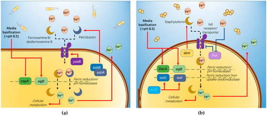 S. aureus-mediated ferric(III)oxide reduction is only observed in a nitrogen-rich medium. However, in the study, culturing S. aureus in 0.1 LB resulted in a cellular deficit. This phenomenon can be attributed to shifting the microbial lifestyle to form biofilms due to the limiting nutrient. S. aureus employs a similar approach in iron(III)oxide metabolism (Figure 6b). Previous studies found that S. aureus readily adheres to amorphous ferric ions such as haem, hemoglobin, and lactoferrin [26], triggering the upregulation of iron-regulated surface determinant (Isd) proteins via the Fur repressor inactivation [27]. The Isd system binds ferric ions through surface receptor interactions and internalizes using lipoproteins and membrane permease. The Isd-internalized ferric ions are bound to staphyloferrin, a siderophore produced by the sbn gene cluster. SbnI is a DNA-binding regulatory protein that senses iron to regulate the synthesis of staphyloferrin [28,29]. The ferric-bound stapyloferrin is reduced to ferrous through interactions with iron uptake oxidoreductase (IruO), a nicotinamide adenine dinucleotide phosphate (NADPH)-dependent reductase. IruO functions as an electron donor to degrading enzymes IsdG or IsdI, releasing ferric ions and reducing them to ferrous ions [30]. Additionally, the surrounding medium’s basification triggers the upregulation of sigB and DacA, a deadenylate cyclase enzyme used in regulating nitrogen metabolism and promoting ammonium and glutamine uptake [31,32,33]. The increased cellular base then reduces ferric ions to ferrous to balance the internal cellular pH [34]. The resulting ferrous ions used in the S. aureus cellular metabolism result in the loss of detectable ferrous ions in the extracellular matrix.