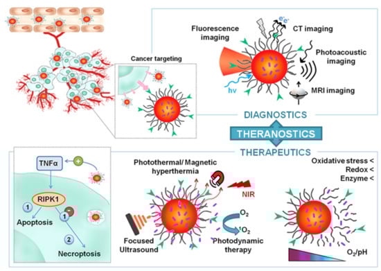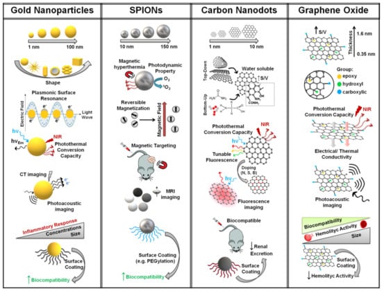 Schematic representation of the main properties and features of metal and carbon nanoparticles used in cancer theranostics. The structure and therapeutic/diagnostic potential is reported according to the literature panorama.