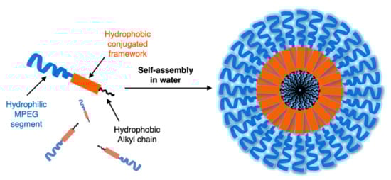 - Yin, C.; Song, W.; Jiang, R.; Lu, X.; Hu, W.; Shen, Q.; Li, X.; Li, J.; Fan, Q.; Huang, W.; et al. Oligo(p-phenyleneethynylene) embedded amphiphiles: Synthesis, photophysical properties and self-assembled nanoparticles with high structural stability and photostability for cell imaging. Polym. Chem. 2014, 5, 5598–5608. [Google Scholar] [CrossRef]