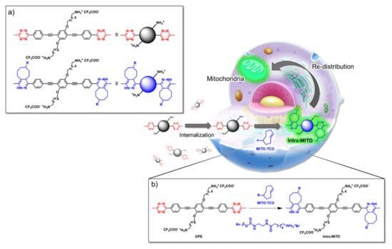 - Wang, J.; Zhou, L.; Sun, H.; Lv, F.; Liu, L.; Ma, Y.; Wang, S. Oligo(p-phenyleneethynylene) Derivatives for Mitochondria Targeting in Living Cells through Bioorthogonal Reactions. Chem. Mater. 2018, 30, 5544–5549. [Google Scholar] [CrossRef]