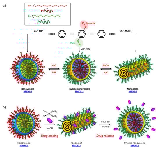 - Samanta, D.; Roy, S.; Sasmal, R.; Saha, D.N.; Pradeep, K.R.; Viswanatha, R.; Agasti, S.S.; Maji, T.K. Solvent adaptive dynamic metal-organic soft hybrid for imaging and biological delivery. Angew. Chem. 2019, 131, 5062–5066. [Google Scholar] [CrossRef]