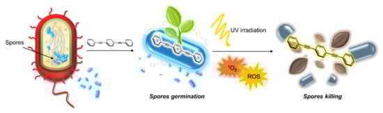 - Pappas, H.C.; Lovchik, J.A.; Whitten, D.G. Assessing the Sporicidal Activity of Oligo-p-phenylene Ethynylenes and Their Role as Bacillus Germinants. Langmuir 2015, 31, 4481–4489. [Google Scholar] [CrossRef]