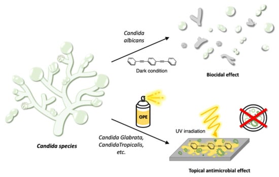 - Pappas, H.C.; Sylejmani, R.; Graus, M.S.; Donabedian, P.L.; Whitten, D.G.; Neumann, A.K. Antifungal properties of cationic phenylene ethynylenes and their impact on β-glucan exposure. Antimicrob. Agents Chemother. 2016, 60, 4519–4529. [Google Scholar] [CrossRef]