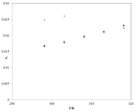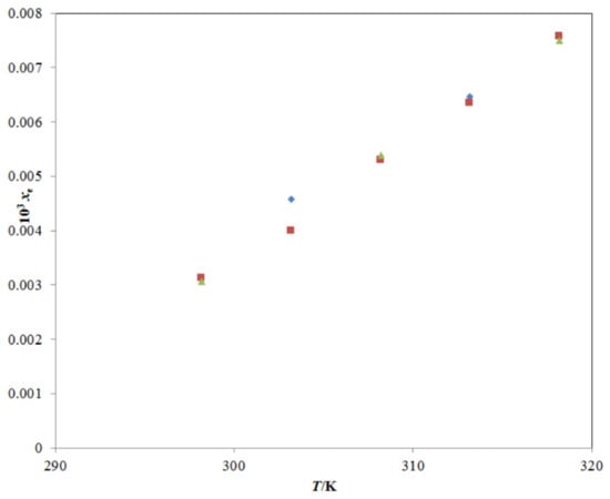 The experimental solubility of TRV in neat ethanol agreed with those reported by Sun et al. [1,27]; however, it deviated significantly from those reported by Ha et al. [2]. The mole fraction solubility of TRV in neat methanol, neat n-propanol, and neat n-butanol at different temperatures has also been reported in the literature [2,27], and a comparison with the present experimental TRV solubility in the same is presented in Figure 4A–C. The experimental solubility of TRV in neat methanol, neat n-propanol, and neat n-butanol also agreed with those reported by Sun et al. [27]; however, it deviated significantly from those reported by Ha et al. [2]. The saturated solubility of TRV in PG was reported as 63.96 mg mL−1 (converted to 2.16 × 10−2 in mole fraction) at 310.2 K by Tang et al. [23]. The saturated solubility of TRV in PG was reported as 9.22 mg mL−1 (converted to 3.18 × 10−3 in mole fraction) at 298.2 K by Balata et al. [22]. The mole fraction solubility of TRV in PG at 310.2 K was not measured in this study. The mole fraction solubility of TRV in PG at 310.2 K was obtained from the interpolation of the graph plotted between ln xe and 1/T and determined as 2.13 × 10−2, which was much closer to those reported by Tang et al. [23]. In this work, the mole fraction solubility of TRV in PG at 298.2 K was 1.73 × 10−2, which deviated from those reported by Balata et al. [22]. Overall, the experimental solubilities of TRV agreed with those reported by Sun et al. and Tang et al. [1,23,27] and deviated from those reported by Ha et al. and Balata et al. [2,22]. The differences in TRV solubilities might be due to differences in analytical methods, equilibrium time, rotational speeds, and other experimental conditions.