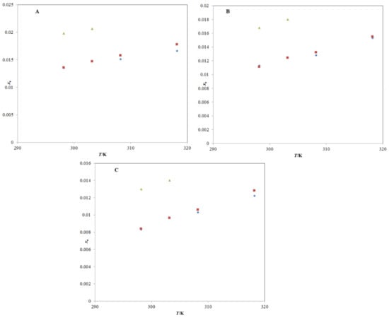 represents the reported solubility values of TRV in (A) neat methanol, (B) neat n-propanol, and (C) neat n-butanol taken from reference [27]; the symbol