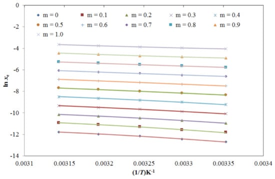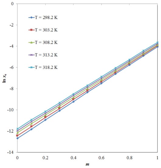where Thm is the mean harmonic temperature and was determined as 308 K. By plotting ln xe values of TRV vs. , the ΔsolH0, and ΔsolG0 values for TRV were obtained from the slope and intercept, respectively, using Equations (13) and (14), respectively [60,61]: