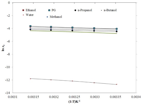 For the evaluation of dissolution properties of TRV in the mono-solvents and PG + water mixtures, apparent thermodynamic analysis was conducted. Three thermodynamic parameters for TRV dissolution properties—ΔsolH0, ΔsolG0, and ΔsolS0—were determined [60,61,62]. The well-known van’t Hoff equation was employed to determine the ΔsolH0 values for TRV in the mono-solvents and PG + water mixtures using Equation (12) [60,61]: