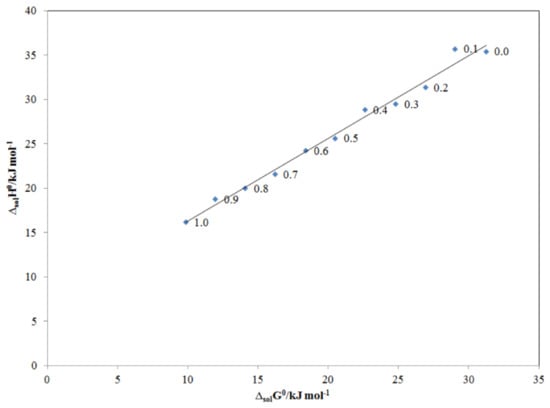 ΔsolH0 vs. ΔsolG0 enthalpy–entropy compensation plot for the solubility of TRV in various PG + water compositions at Thm = 308 K.