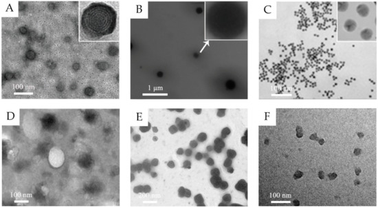 (A) TEM images of 5-aminolevulinic acid-loaded ethosomal vesicles. Adapted from Reference [8] with permission of The Royal Society of Chemistry. (B) TEM images of triptolide-loaded nanostructured lipid carriers (NLC). Adapted from Reference [11] with permission. (C) TEM images of the citrate-capped gold nanoparticles. Adapted from Reference [12] with permission. Copyright (2017) American Chemical Society. (D) TEM images of silk fibroin nanoparticles. Reproduced from Reference [13] Copyright (2018), with permission from Elsevier. (E) TEM images of water-in-oil (w/o) nanoemulsions of caffeine. Reproduced from Reference [14]. Copyright (2010), with permission from Elsevier. (F) TEM images of hyaluronic acid nanogels. Reproduced from Reference [15]. Copyright (2015), with permission from Elsevier.