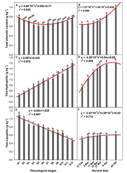 2.2. Effect of the Phenological Stage and Harvest Date on Total Phenol Content and the Total Hydrophilic (TAA-H) and Lipophilic (TAA-L) Antioxidant Activity