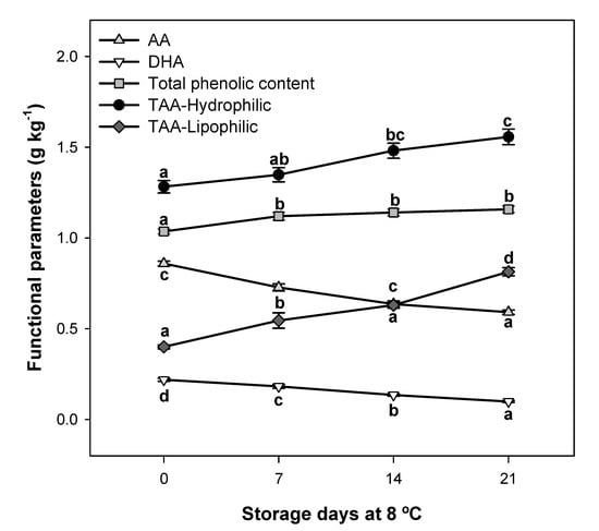 2.3. Evolution of Functional Parameters during Postharvest Storage