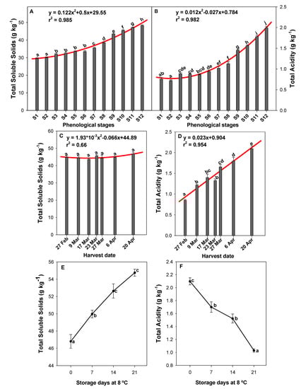 2.4. The Effect of the Phenological Stage, Harvest Date, and Postharvest Storage on Total Soluble Solids (TSS) and Total Acidity (TA)