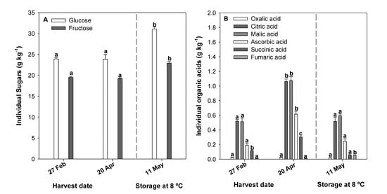 2.5. The Effect of Harvest Date and Postharvest Storage on Individual Sugars and Organic Acid Content