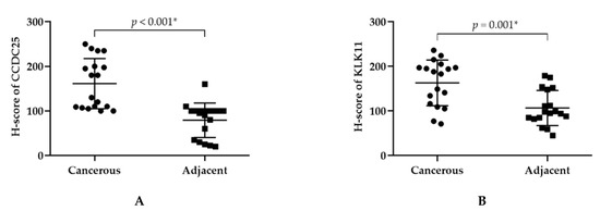 H-scores of CCDC25 and KLK11 in CCA tissues by using immunohistochemistry. (A) H-score of CCDC25. (B) H-score of KLK11. Mann–Whitney U test was used to compare H-scores between cancerous and adjacent tissues of CCDC25 and KLK11. * Statistical significance (p < 0.05).