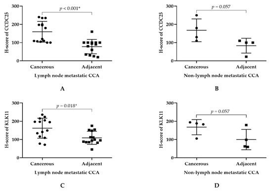Since the expression of either KLK11 or CCDC25 was associated with the metastasis of colorectal cancers [9,10,11,12,13], the expressions of CCDC25 and KLK11 in CCA with or without lymph node metastasis were analyzed. The results show that the expressions of both CCDC25 and KLK11 were significantly higher in cancerous tissues than in the adjacent tissues of CCA with lymph node metastasis (p < 0.001 and p = 0.018, respectively) (Figure 3A,C), but not in the CCA without lymph node metastasis (p = 0.057 and p = 0.057, respectively) (Figure 3B,D).