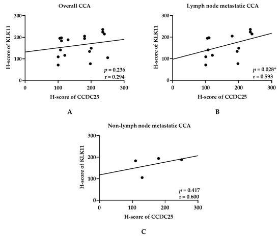 Correlation between CCDC25 and KLK11 H-score in cancerous tissues of (A) overall CCA patients, (B) CCA patients with lymph node metastasis, (C) CCA patients without lymph node metastasis. * Statistical significance (p < 0.05).