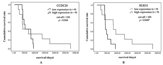 To assess whether CCDC25 and KLK11 can be the potential prognostic markers, the association between CCDC25 and KLK11 expression with the survival time of CCA patients was examined. The CCA patients were divided into low- and high-expression groups of CCDC25 and KLK11, using median values as the cut-off of CCDC25 and KLK11 (155 and 185, respectively). The association between CCDC25 and KLK11 and overall survival time were determined using the Kaplan–Meier analysis. The results demonstrated that the overall survival time of CCA patients with a high expression of KLK11 was significantly shorter than those with a low expression of KLK11 (414 vs. 809 days, respectively; p = 0.048) (Figure 5B). By contrast, the overall survival time of the CCA patients was not significantly different (519 vs. 409 days, respectively; p = 0.566) between high and low expression of CCDC25 (Figure 5A).