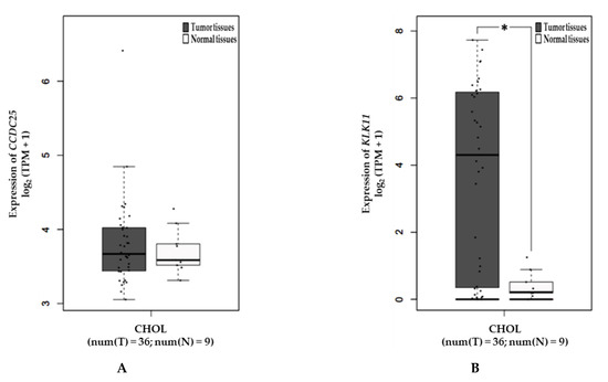Expression of CCDC25 and KLK11 mRNA in CCA tissues analyzed by using GEPIA. (A) Expression of CCDC25 in CCA. (B) Expression of KLK11 in CCA. * Statistical significance (p < 0.05).