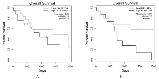 Kaplan–Meier survival curve analysis of CCDC25 and KLK11 mRNA expression levels and overall survival time of the samples obtained from GEPIA. The curves show overall survival of CCA patients having high expression (black line) and low expression (grey line). The survival time of CCA patients between low- and high-expression groups of (A) CCDC25 and (B) KLK11. * Statistical significance (p < 0.1).
