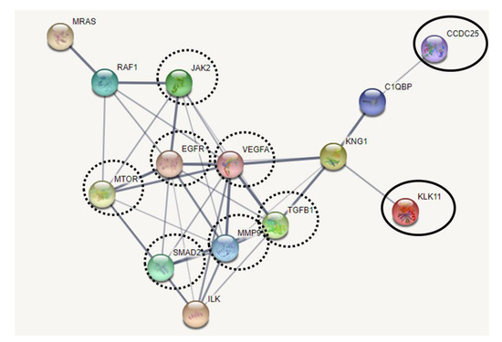 The interaction map of CCDC25, KLK11, and metastasis-related proteins. Protein–ligand interaction was predicted by STRING version 11.0. Protein–protein interactions were represented by solid lines. Stronger associations were represented by thicker lines. Weak associations were represented by thin lines. CCDC25 and KLK11 were represented in solid circles. Metastasis-related proteins were represented by dashed circles.