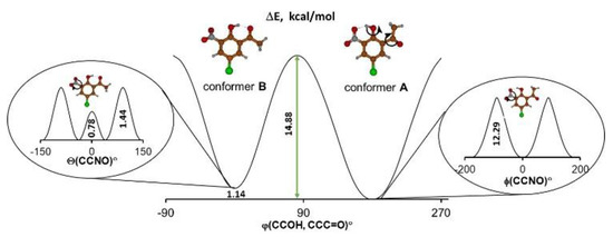 Such a result may seem unconvincing because the torsional angle at 0 degrees (a flat molecule) is usually characterized by minimal potential energy because of π-electronic coupling between the nitro group and phenyl moieties. However, the studied molecule displayed a significant steric repulsion between the oxygen of the nitro group and the oxygen of the hydroxyl group, which counteracts the π-electronic coupling. Such steric repulsion results in the appearance of an energy barrier (ΔE = 0.78 kcal/moL) at Θ = 0° (Figure 1). Notably, this barrier is not large; thus, the nitro group can easily change its position with respect to the phenyl ring. The process of reorientation of the hydroxyl group leading to the transition from conformer A to conformer B is more complicated and is presented in Supplementary Materials (Supplementary Materials, Figure S1). Judging from the calculated energy barrier of 14–15 kcal/mol, one expected the existence of both conformational forms at a reasonable temperature [21]. Taking these findings into account, we assumed that the studied compound featured polymorphism brought about by the rotation of the nitro group, or by a significant conformational change introduced by the reorientation of the hydroxyl group.