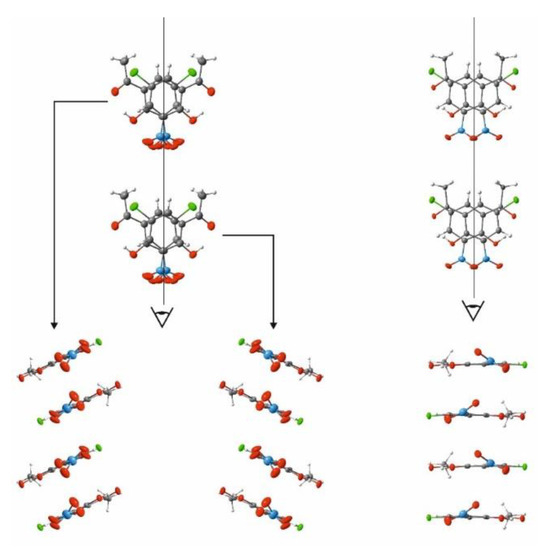 The comparison of the structural data and the packing of the molecules in the crystal cell of both polymorphs made it possible to conclude that the phase transition was conditioned by the following phenomenon. A decrease in temperature tightened the packing of the molecules in the cell and, therefore, caused a stronger interaction between the nitro groups. Polymorph II featured “jagged” nitro groups, which evoked the stable position of molecules in the crystal cell upon temperature decrease. Polymorph I lacked this phenomenon, having the possibility of a looser nitro-group rotation at room temperature, which stopped when the temperature was lowered. The decreasing temperature led to stronger interactions between nitro groups and shifted the molecules towards each other, triggering the phase transition. Such a conclusion was verified by comparing the packaging of CNK to that of the structurally similar 5-methyl-3-nitro-2-hydroxyacetophenone (MNK) [22]. For MNK, the nitro groups were oppositely directed and not able to interact strongly, so they did not provoke tensions in the crystal cell. Therefore, the structurally close MNK did not exhibit phase transition and polymorphism (cf. Figure S5, SM).